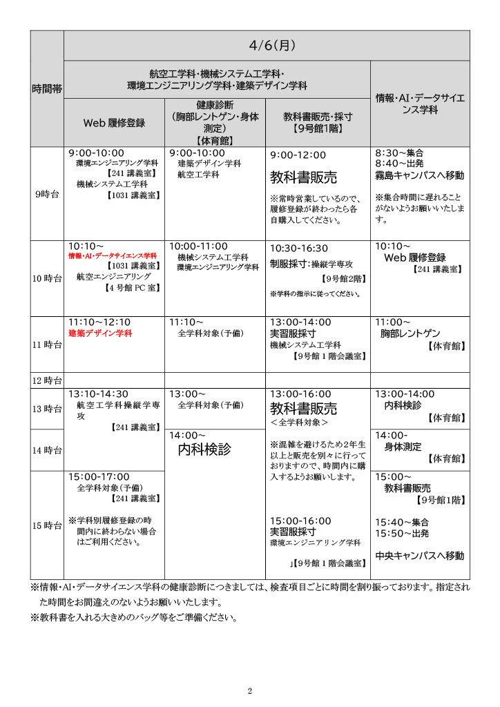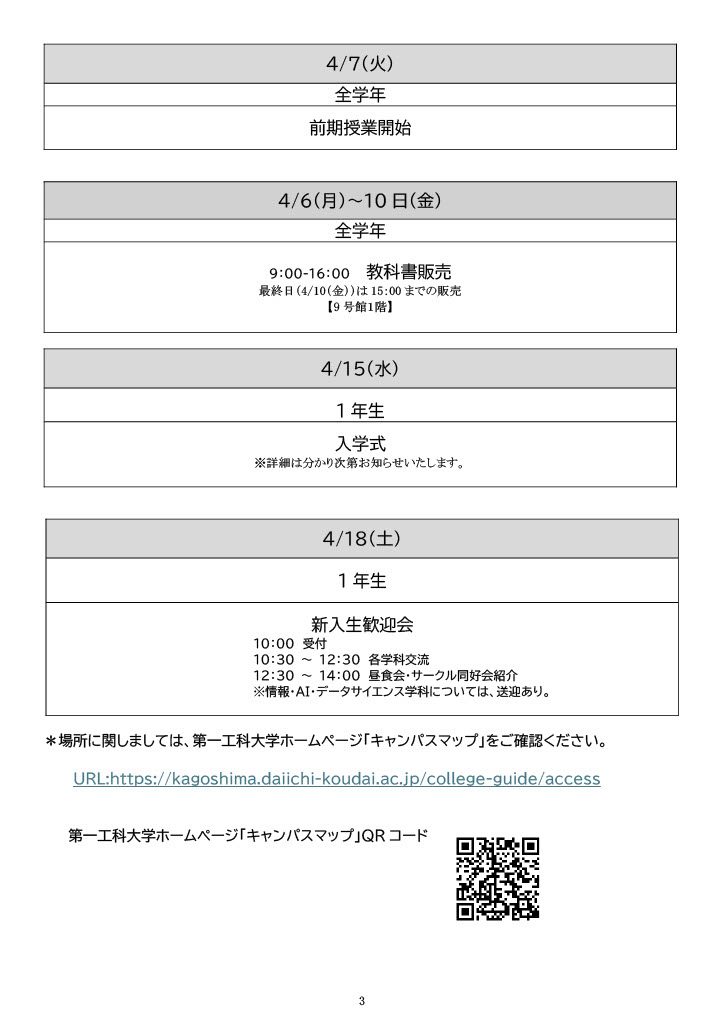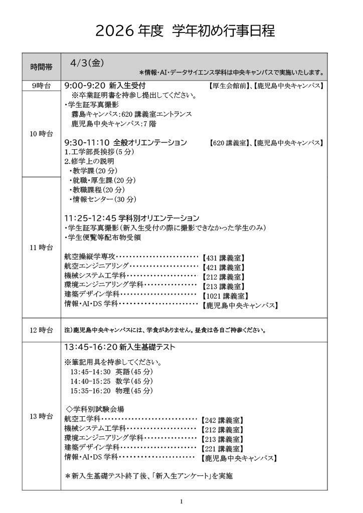 【新入生】2026年度学年初め行事日程