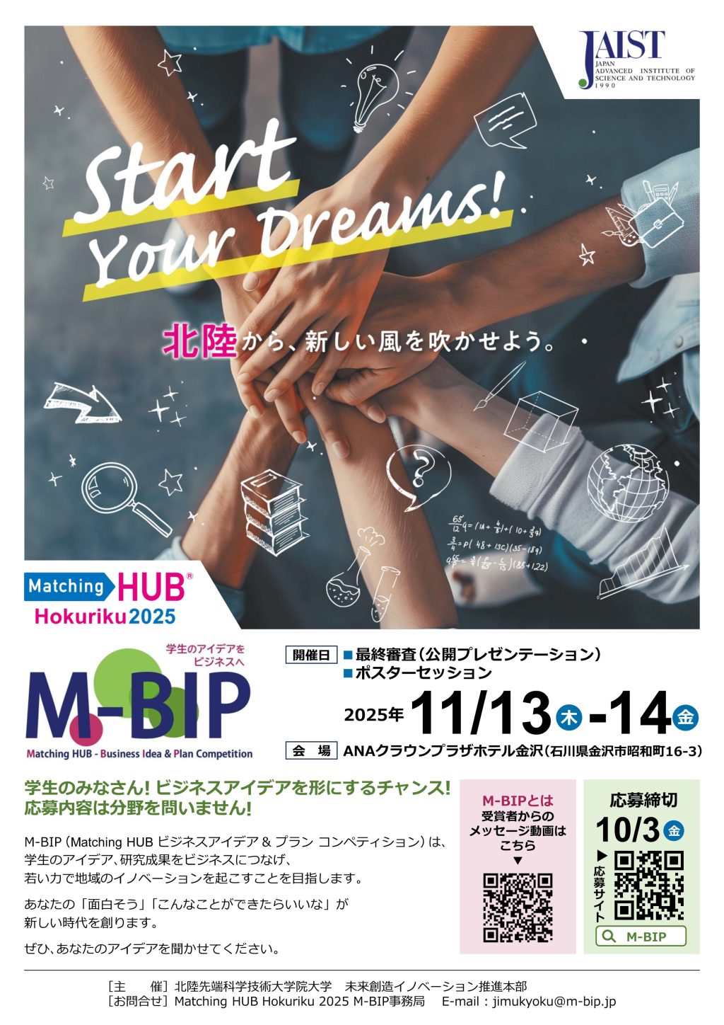 M-BIP(ビジネスアイデア・プランコンペティション)は、北陸先端科学技術大学院大学主催の産学官金連携イベント「Matching HUB Hokuriku」の企画として行っている“学生のビジネスアイデアコンテスト”です。