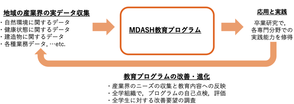 本教育プログラムは、数理・データサイエンス・AIの知識、技能を社会課題の解決に活用できる高度な技術者を育成することを目的としています。プログラムの授業では、教員や学生が研究活動で収集した地域の産業界の実データを活用して学習します。またプログラムで修得した知識、技能を、卒業研究で学生の各専門分野に応用、実践することで、実践能力を養います。「リテラシーレベル」、「応用基礎レベル」ともに全学部・学科の学生を対象に開講しています。