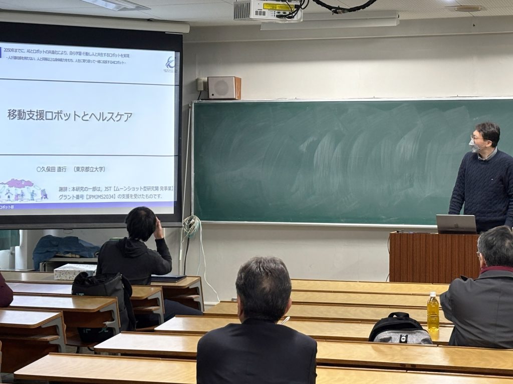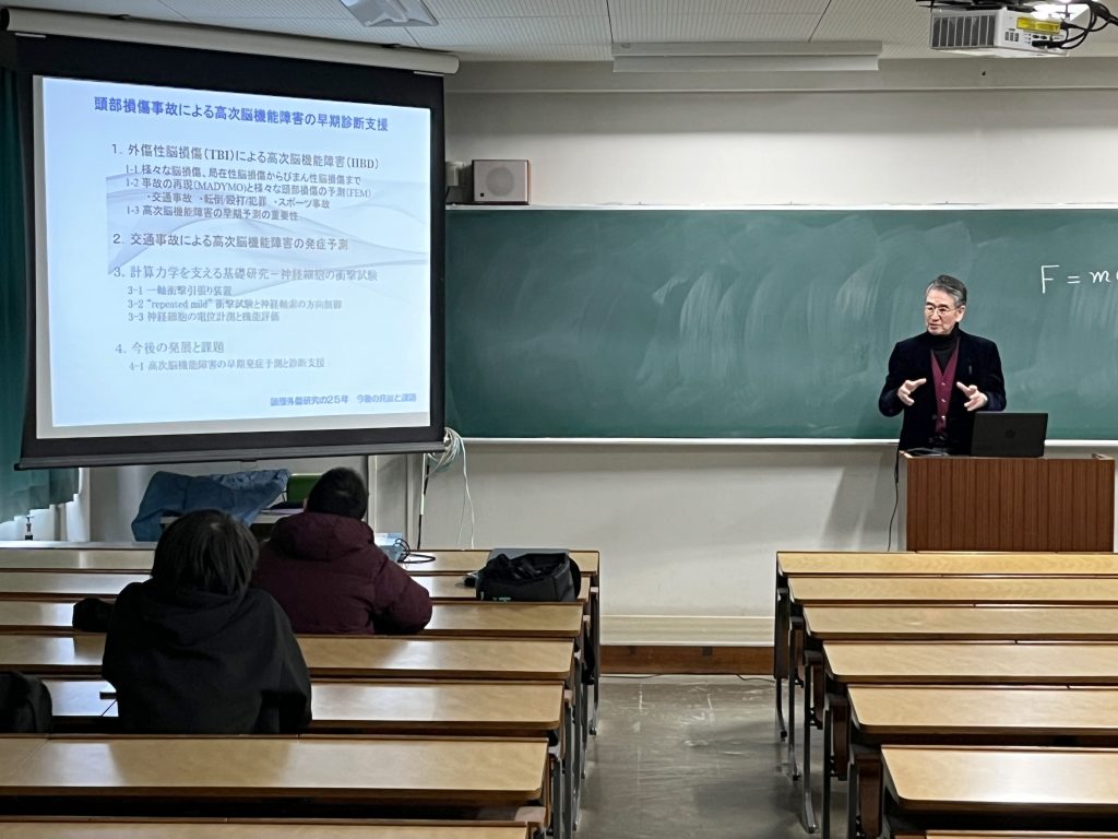 また外部講師として、東京都立大学久保田直行教授が「移動支援ロボットとヘルスケア」というタイトルで、青村茂教授が「頭部損傷事故の再現・解析と脳神経細胞の衝撃耐性評価による高次脳機能障害の早期診断支援」というタイトルでお話されました。