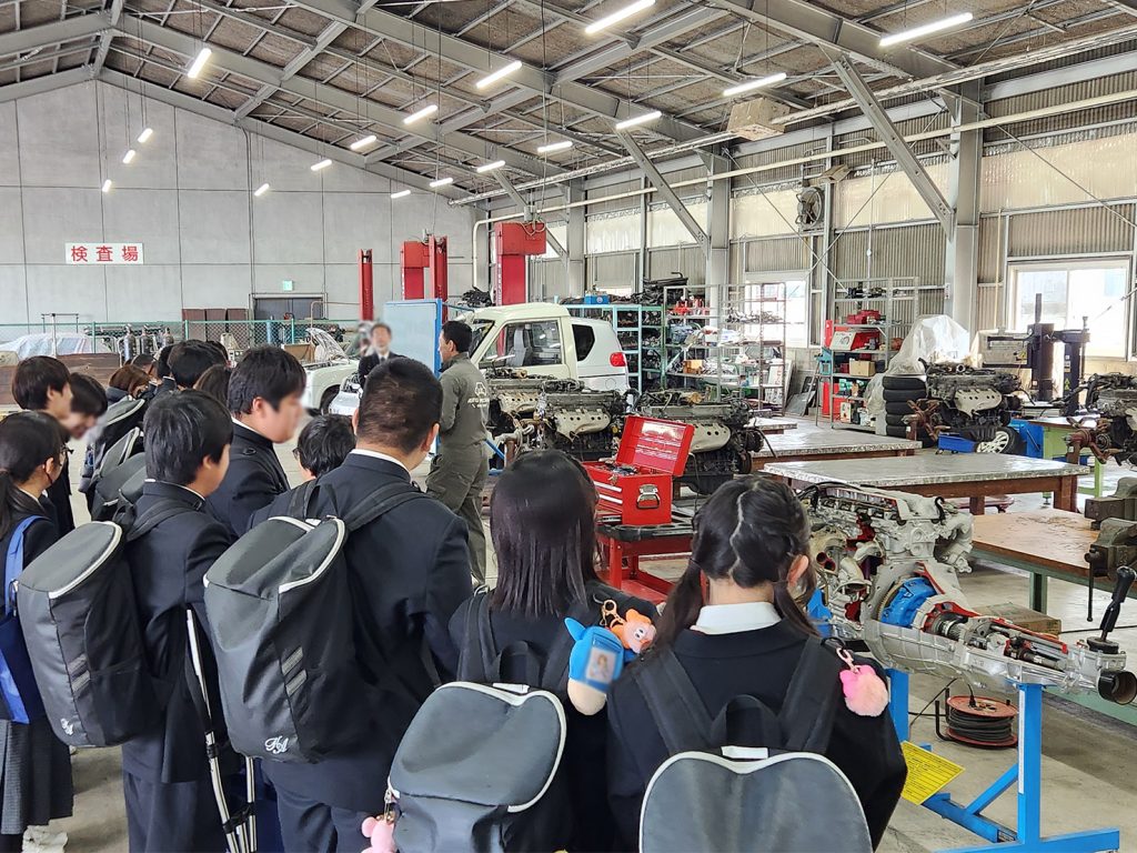 その後は同科の自動車実習棟へ移動し施設の見学と実習機器の体験・紹介をし、自動車をリフトアップさせシャーシ(車のお腹/下の部分)を見ていただきました。
