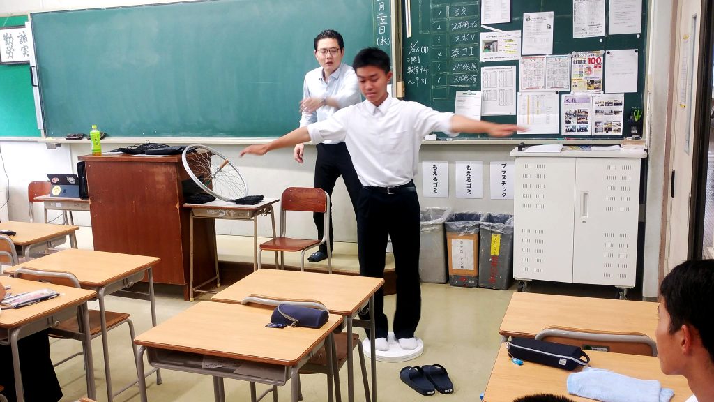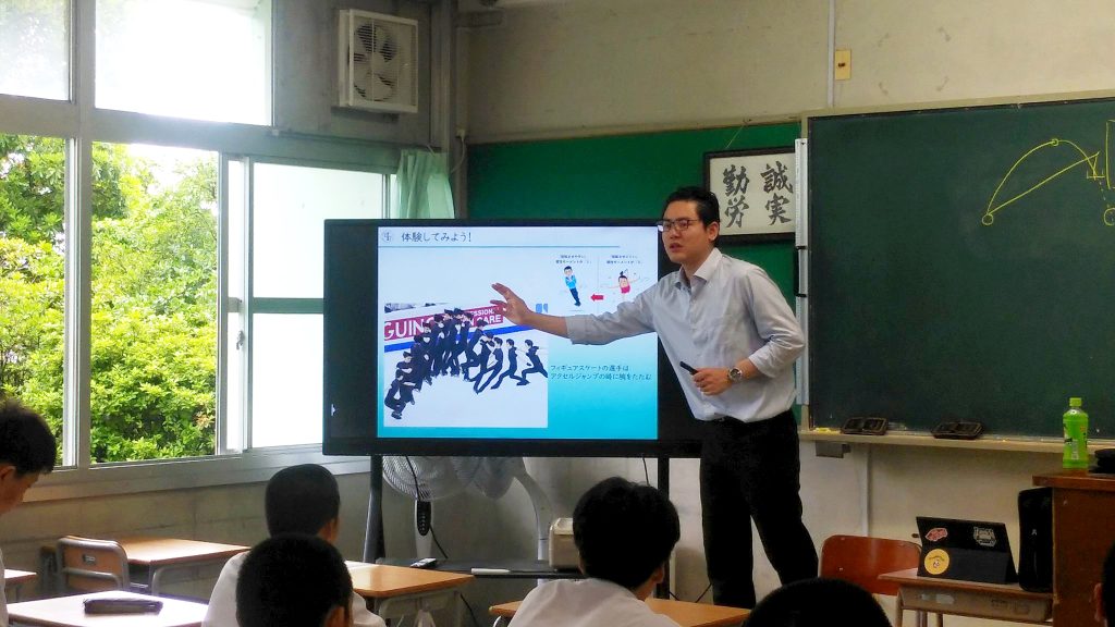「スポーツとAI」「スポーツバイオメカニクス」をテーマに講演と実技の2時間の授業でした。学生たちは、スポーツを理論的に考える視点を学ぶとともに、フィギュアスケートでのアクセルジャンプでなぜ腕をたたむのか、手押し相撲を通して、どうやってバランスをとるのが安定するのかについて楽しく体験しました。