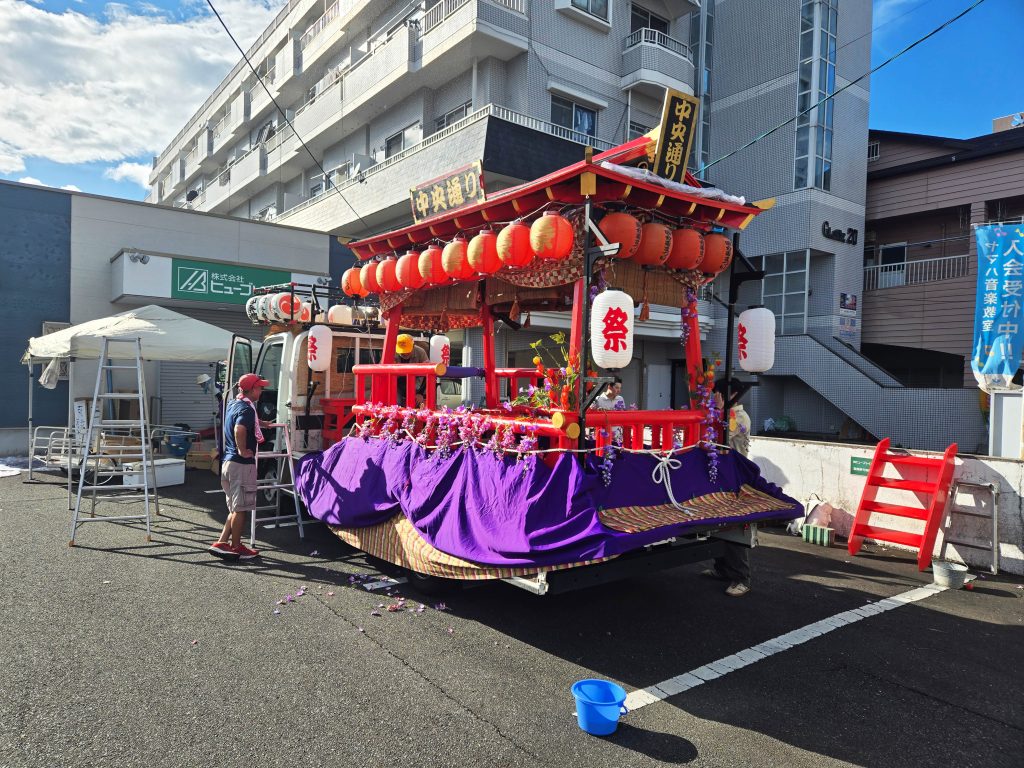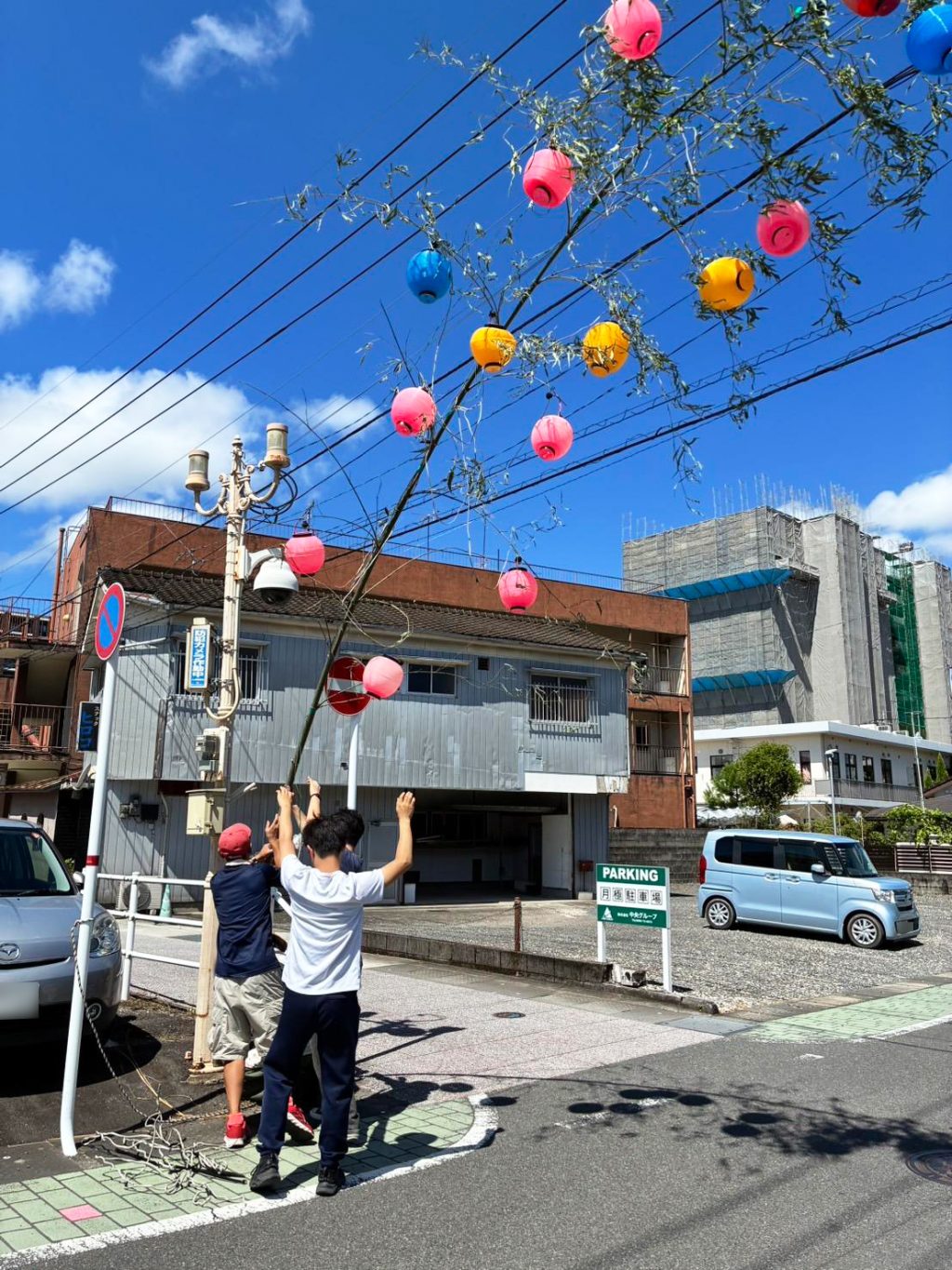 地域の皆さまと協力しながら、色鮮やかな提灯を竹に取り付けて設置し、夏祭りの装飾をお手伝いしました。炎天下での作業となりましたが、お互いに声を掛け合いながら無事に終えることができました。