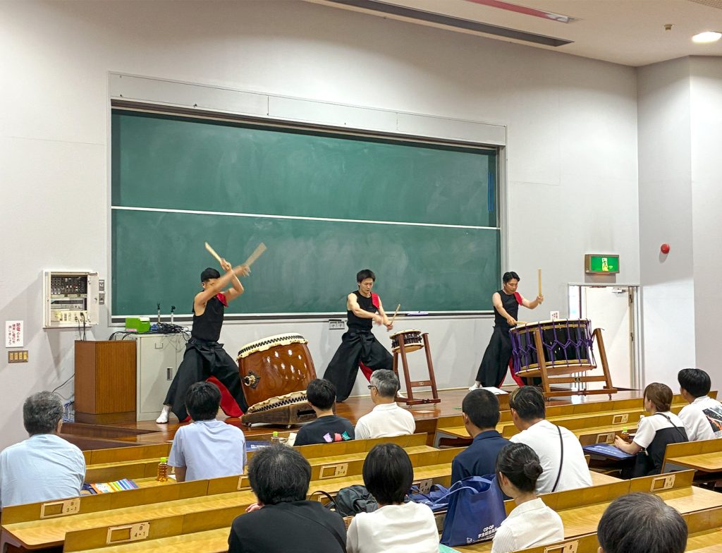 霧島キャンパスでのオープンキャンパスの内容は、まずオープニングアクトとして地元芸能の「天孫降臨霧島九面太鼓保存会」より迫力満点の太鼓演奏をして頂きました。