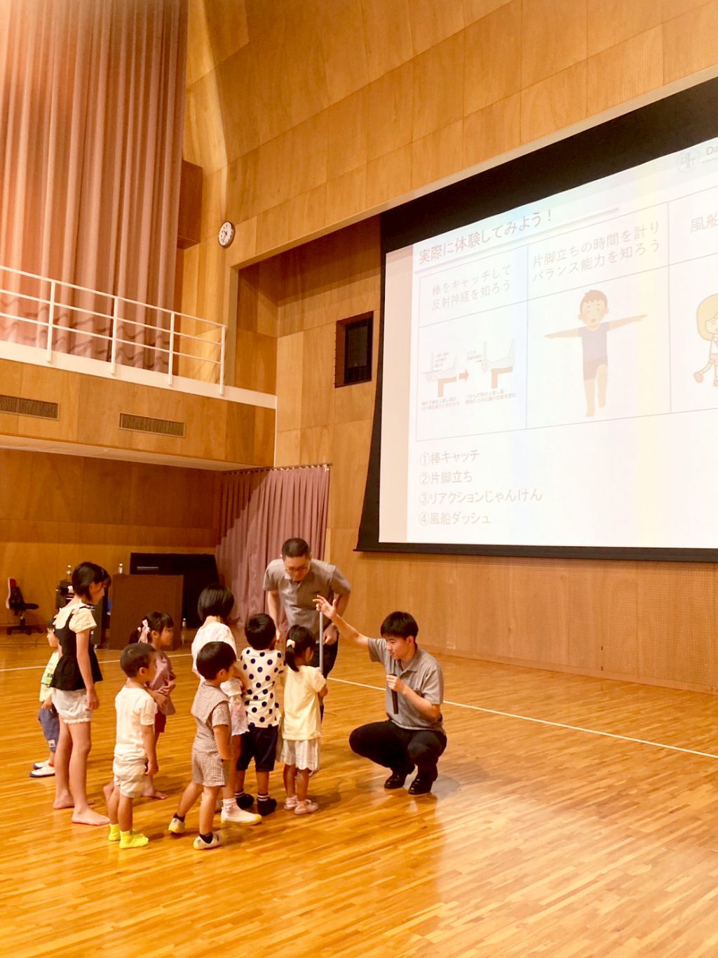 7月19日(土)、情報・AI・データサイエンス学科の竹下康文講師、中島将武助教が鹿児島第一幼稚園「わくわくプログラム」にて「親子対決!楽しんでできるスポーツ科学体験を通して自分たちの身体能力を知ろう!」というテーマの講座を行いました。