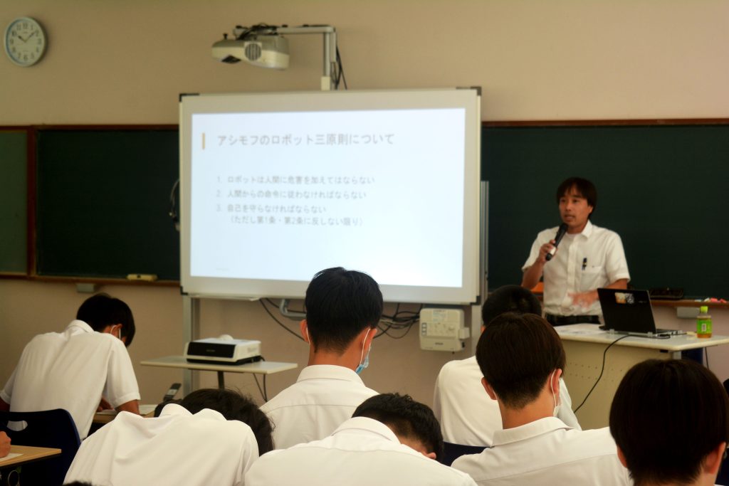 授業では、情報社会の利便性と課題を整理し、インターネットによる即時性やAI活用による新しい価値創出の一方で、情報過多やデジタル・デバイド、セキュリティ問題などの課題について解説しました。また、アシモフのロボット三原則を例に挙げ、AIに倫理を適用できるのかという問いを通して、公平性や責任、プライバシーといった現代的な課題を考えました。