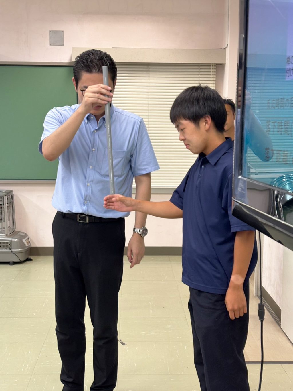 後半では反射神経の重要性に関する講義と棒落下テストによる測定を行い、物理計算から自分の反応速度を算出する体験を行いました。