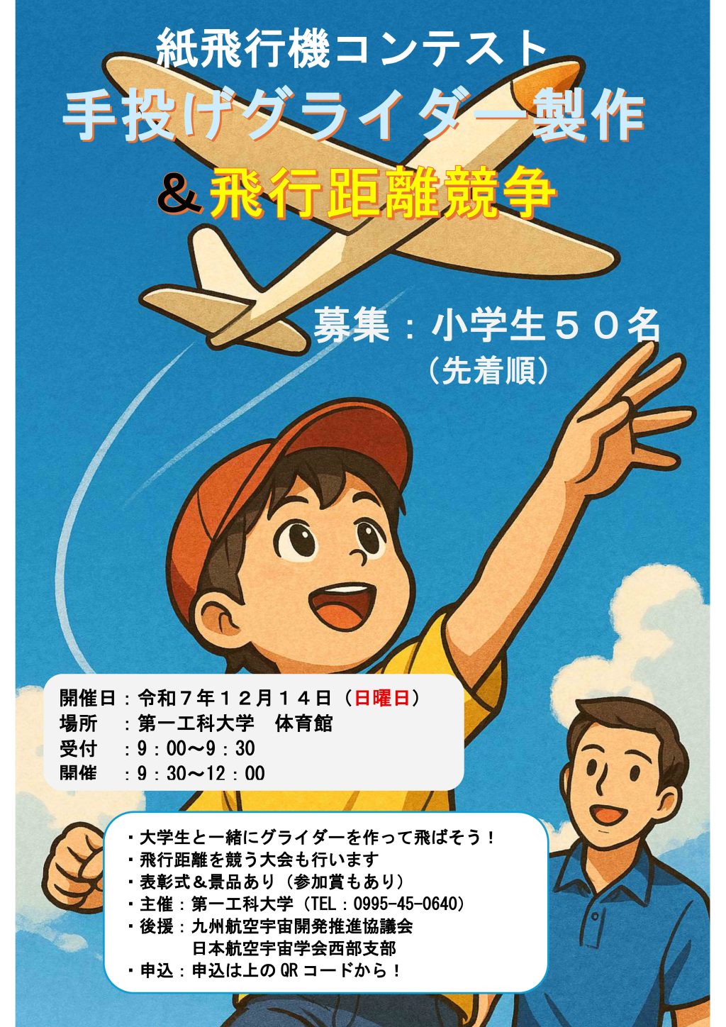 令和7年12月14日(日)に、第一工科大学霧島キャンパス体育館にて「紙飛行機コンテスト ~手投げグライダー製作&飛行距離競争~」を開催いたします。