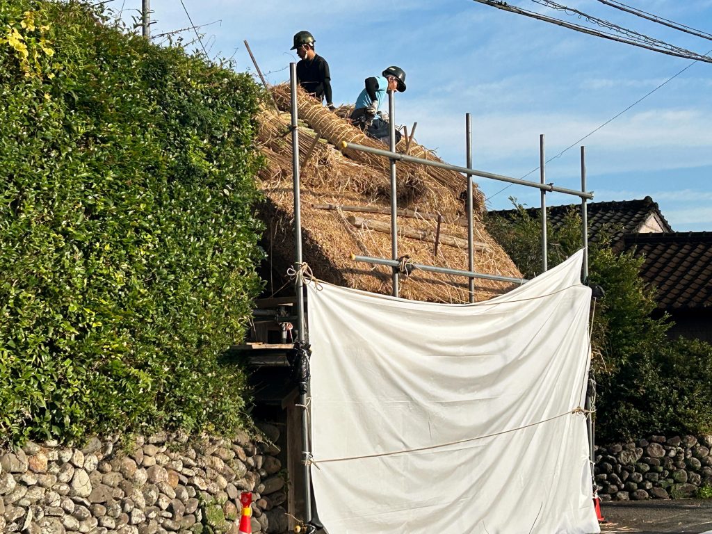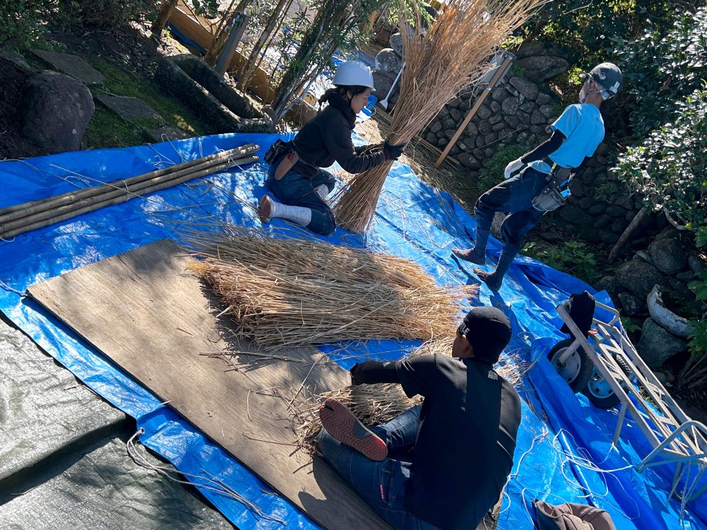 入来花水木会は、800年近くの古い歴史を誇る武家屋敷群入来麓地区の美観や景観の維持存続を目指し、先人たちが残した日本遺産の入来麓を守り文化を伝承する活動を続けていますが、今回の茅葺屋根の葺き替えは同会の入来院久子会長自宅の茅葺門の屋根の葺き替えが行われることで実施されました。