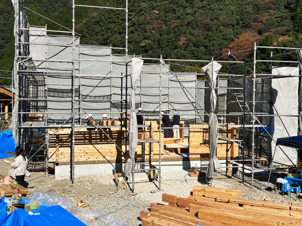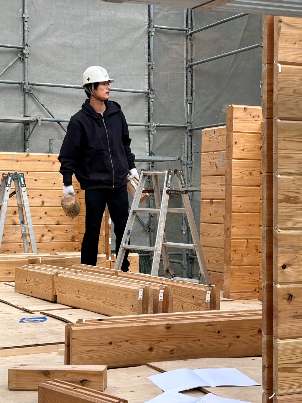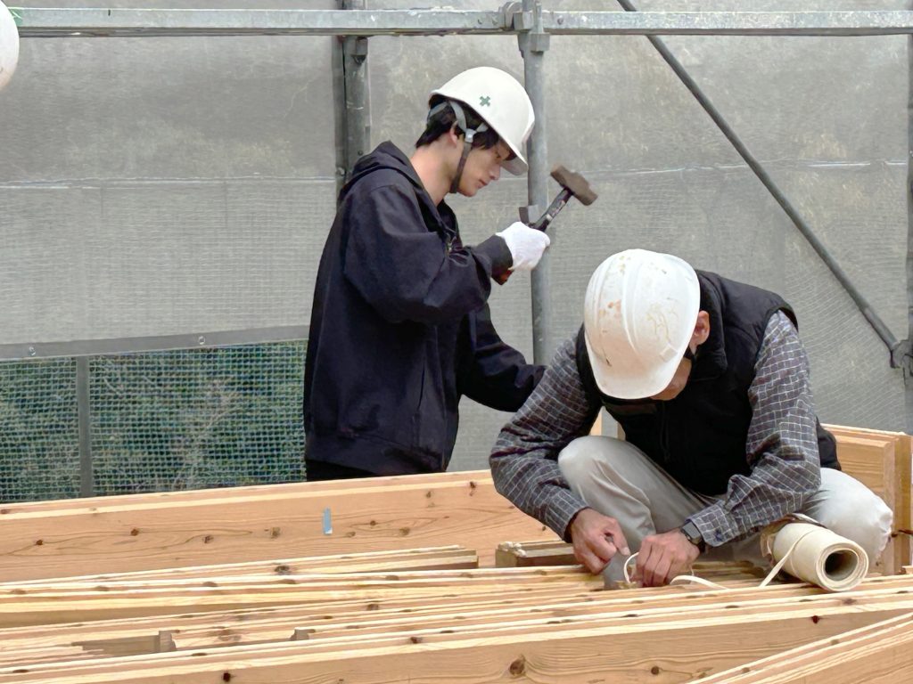 11月24日(月)、建築デザイン学科3年生西元春輝さんが、宮崎県西米良村で実施されている「観光拠点整備事業・かりこぼーずの宿」の建築工事を体験しました。