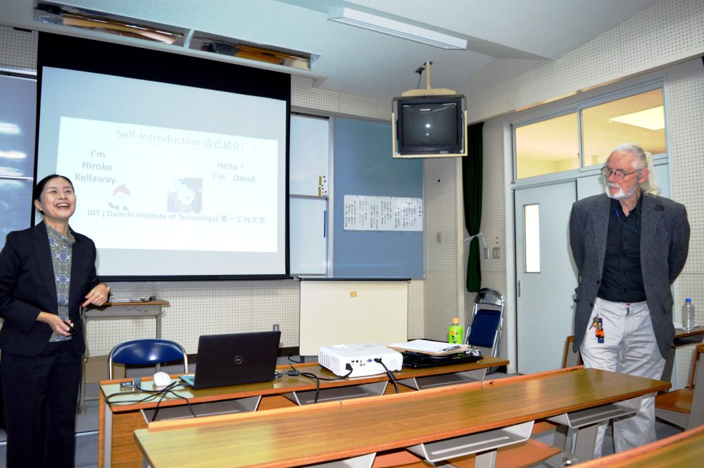 航空工学科David Kellaway講師(オーストラリア出身)、共通教育センターケラウェイ宏子講師、馬麗娜助教(中国出身)の3名が担当し、高校1年生から3年生まで約30名の生徒が参加しました。