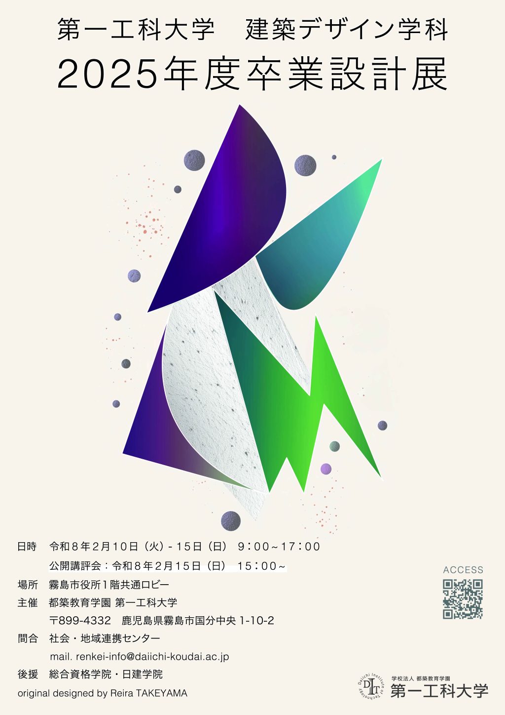2月10日(火)〜15日(日)の期間、霧島市役所1階ホールに学生の卒業設計作品を展示します。