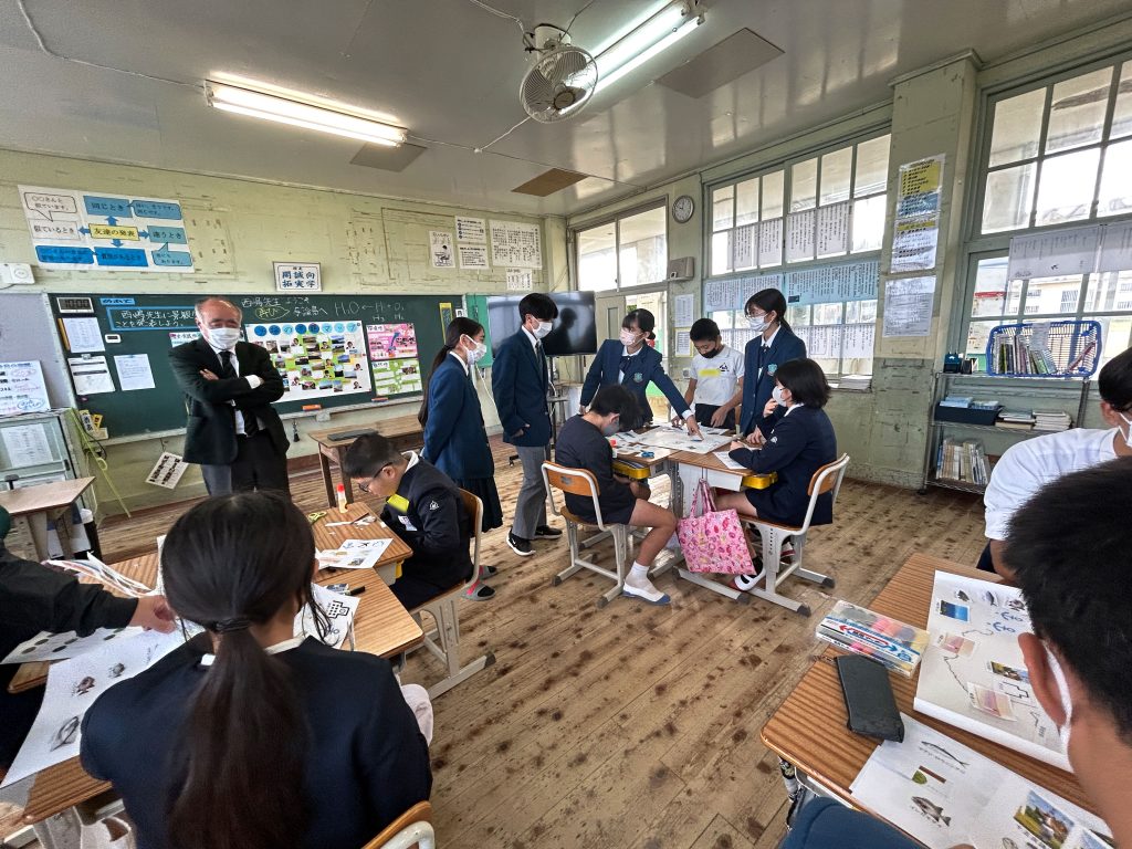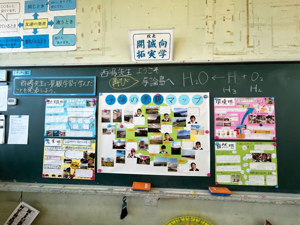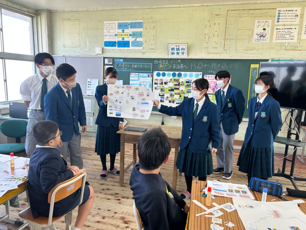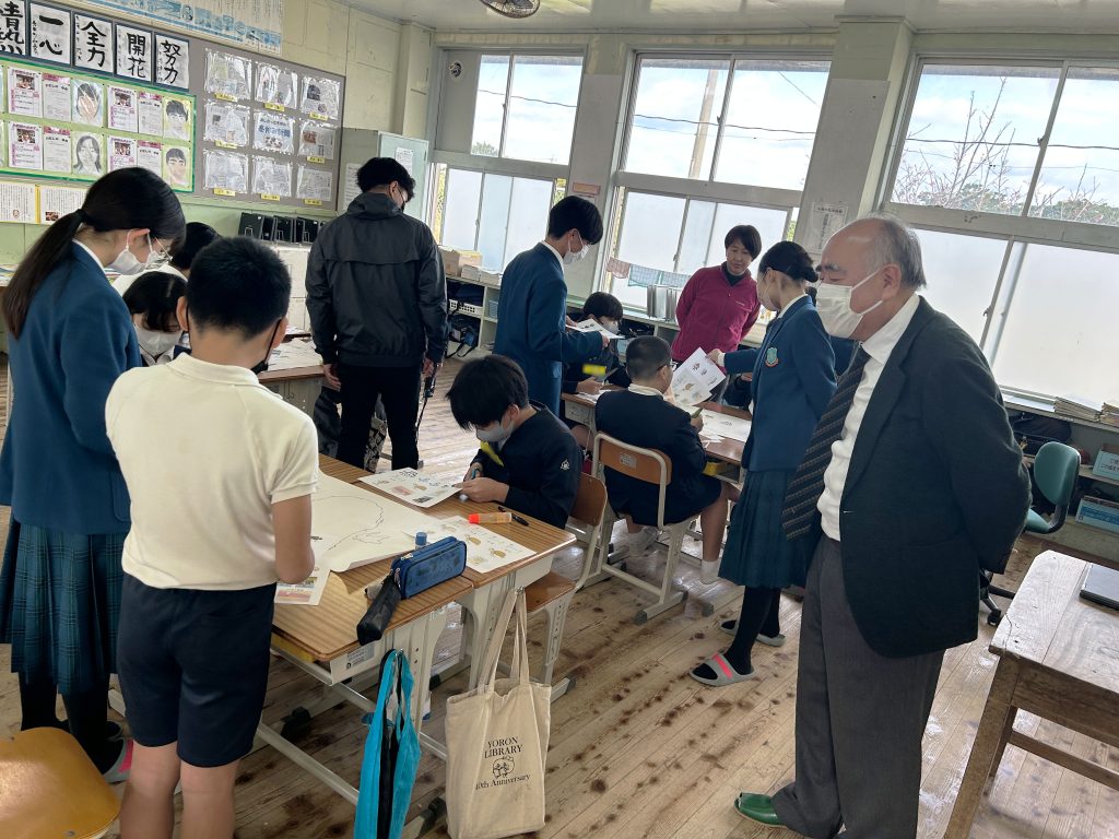 またこの日は、那間小学校を卒業した与論高校の三年生6名が授業のアシスタントで参加し、生徒たちと一緒に「与論島の景観マップ」を作成しました。