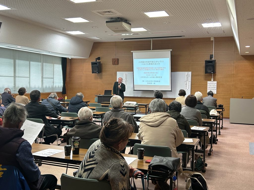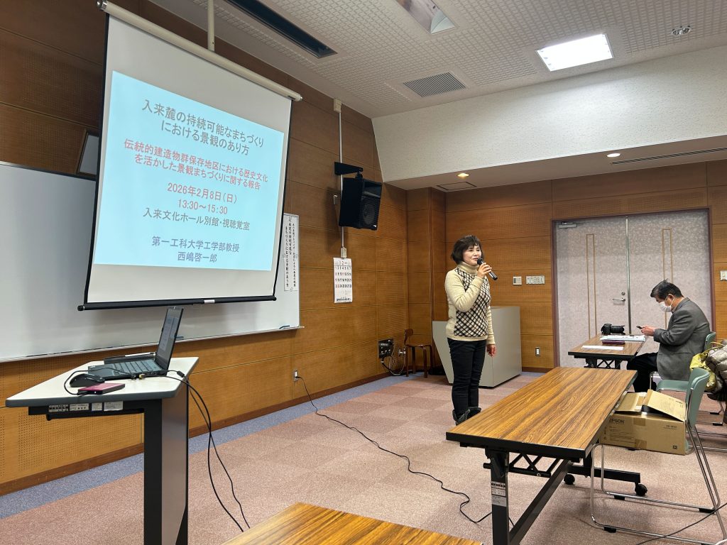 この講演会は鹿児島県が進める景観まちづくり事業の一環で、2003年から伝統建造物群保存地区に指定された入来麓地区のまちづくり団体である入来花水木会の主催によって、景観計画と観光産業振興を専門とし、鹿児島県から景観アドバイザーを委嘱されている西嶋教授が招聘されたものです。