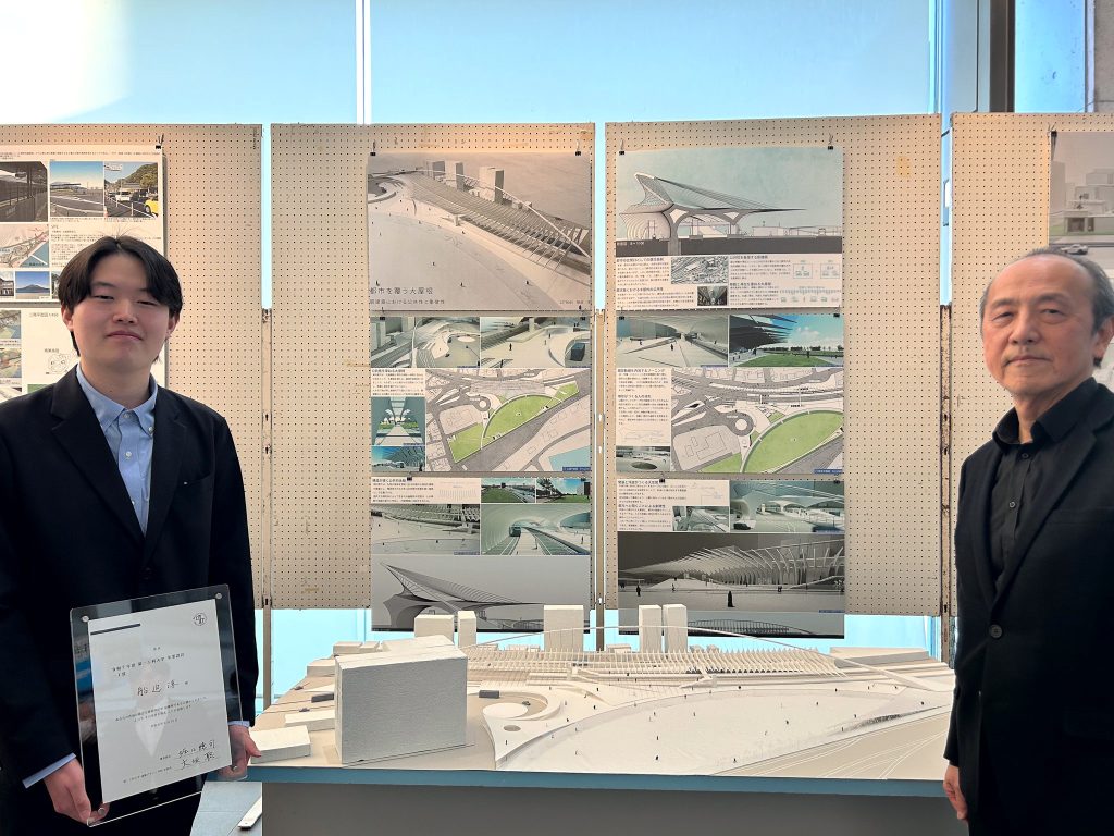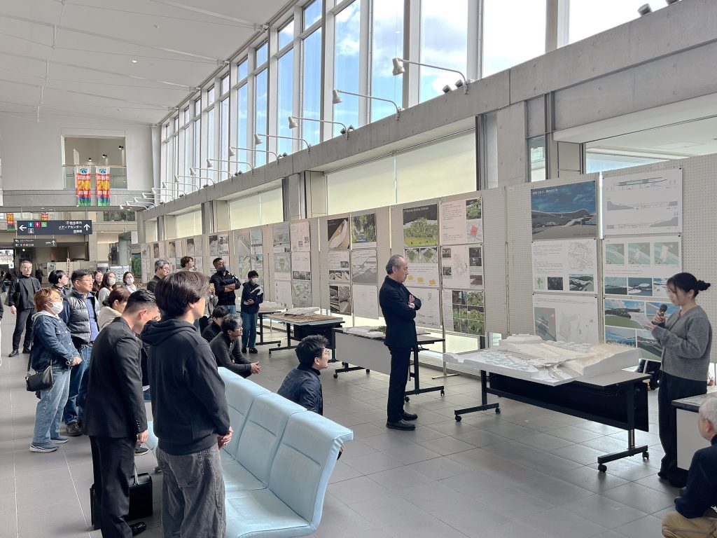 最終日の2/15(日)は公開講評会を実施しました。学生たちは模型やプレゼンシートを使って発表するハレの場になりました。ゲストクリティークには大和大学の堀口先生をお迎えし、最優秀賞「一工賞」には、船迫淳さんの「都市を覆う大屋根 ― 駅建築における公共性と象徴性」が選ばれました。