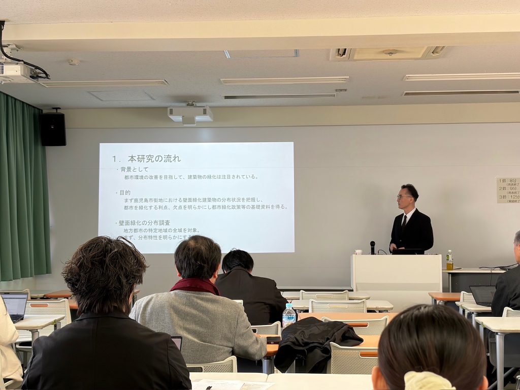 各発表テーマは、木野田さんは、「日本の空港配置と航空機の地上運用効率〜航空運用データにもとづく定量分析〜」、吉村さんと中熊さんは、「第一工科大学建築デザイン学科で行われている講義「建築CAD」での知識の習得と安定に向けた手法に関する検証と考察」、辻教授は、「鹿児島市街地における壁面緑化建築の分布に関する実態調査」でした。